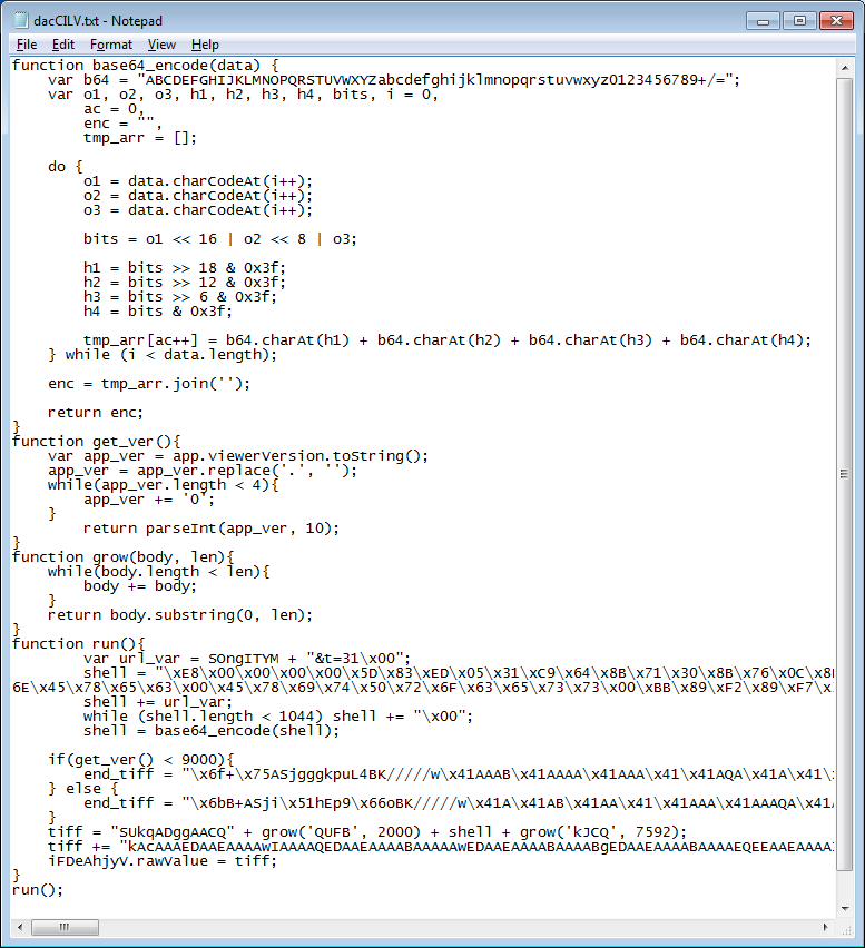 The deobfuscated script reveals that it determines which version of Acrobat the user has then gives them the appropriate PDF exploit. Both PDF files uses the same obfuscation technique which is to swap characters around. This appears to be good enough to get past most AV scanners.