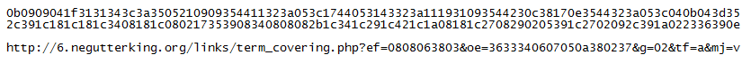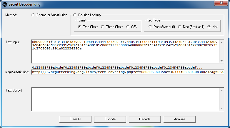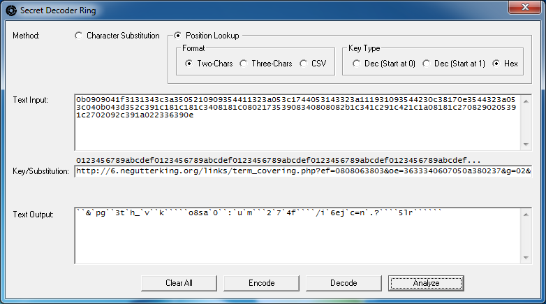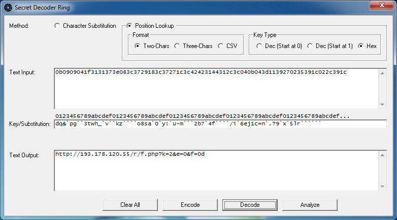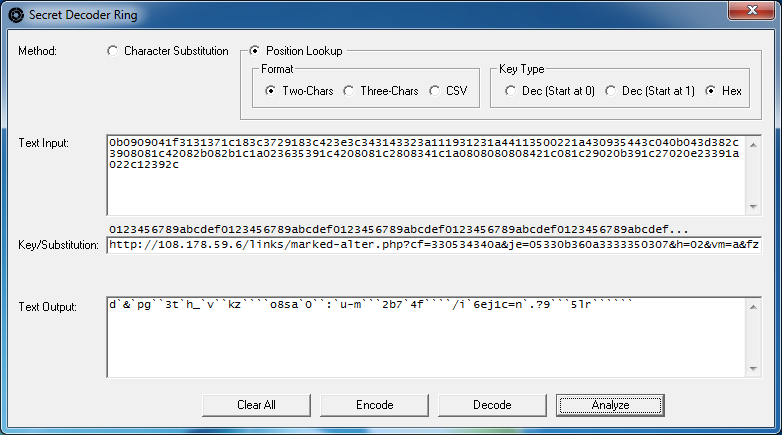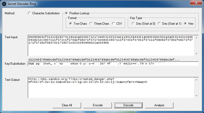 Cool! If you haven’t figured out how this position lookup works, the above graphic should make it more clear. The first two bytes of the encoded value (“text input” field) are “0b”. Just above the “Key/Substitution” field are a set of incrementing hex values. Go to position 0x0b and get the character directly underneath it, which is “h”. That’s the first character of the URL! The next two characters are “09” so go to the 0x09 position and get that character which is “t”. Got it?