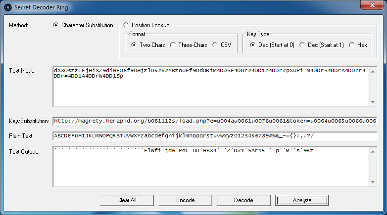 The program also helps you tackle another type of “encoding method” called character substitution. The program acts a little differently for this method. You will need to enter a “plain text” value. I’ve already included a common set of URL-related characters but it probably won’t work for all cases so you can adjust it as needed. In addition, the length of the “plain text” must match the length of the starting string (all those ` characters) since this is a subtitution cipher after all.