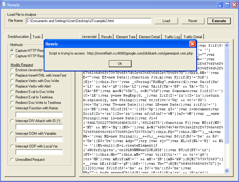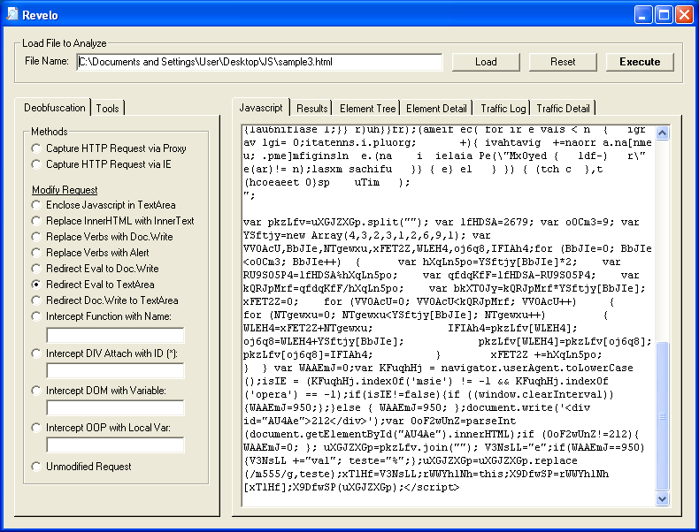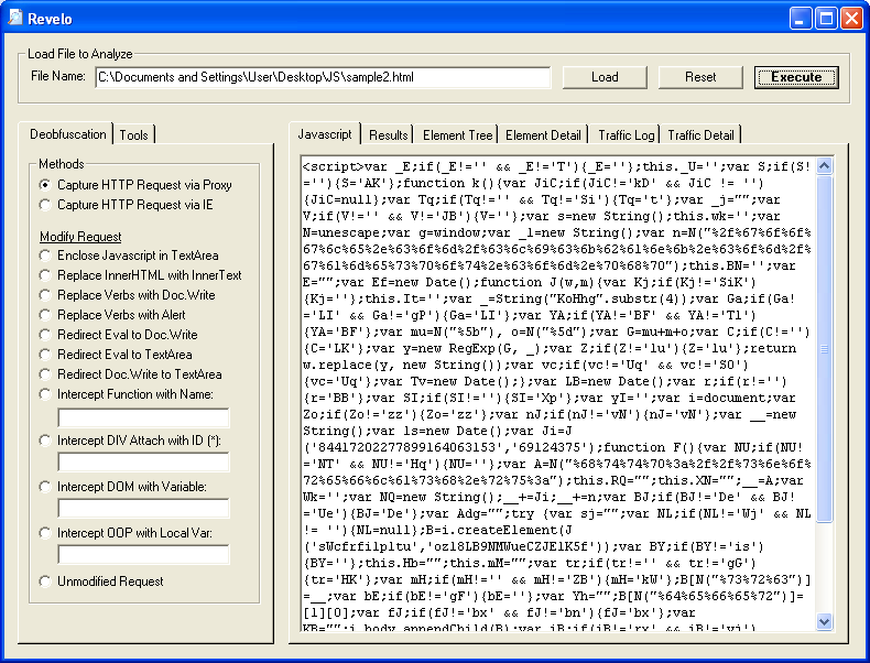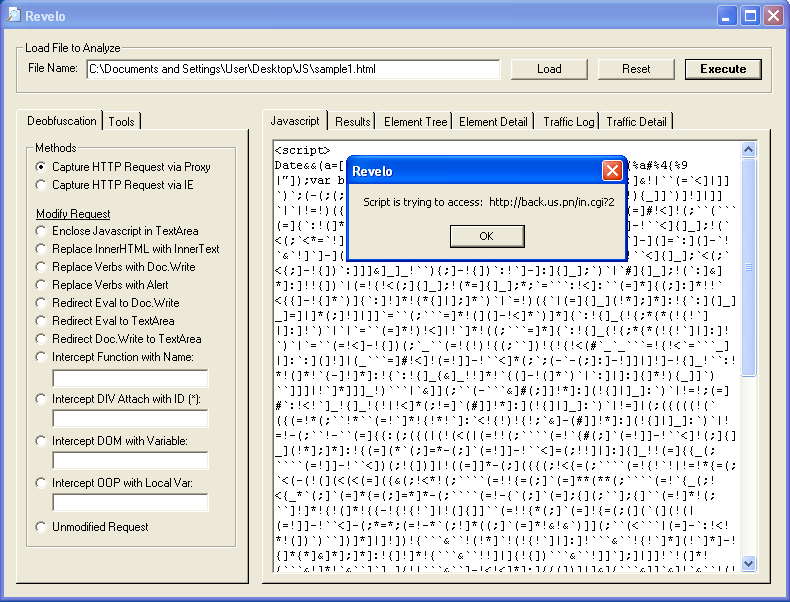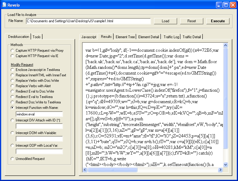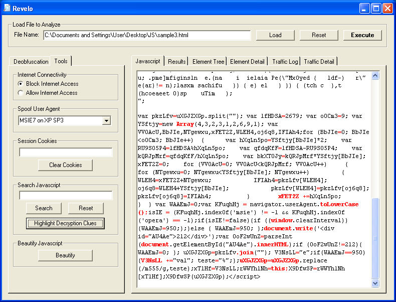 The purpose of this program is to assist the user in analyzing obfuscated Javascript code, particularly those that redirect the browser to malicious URLs. My hope is that this tool helps you learn more about deobfuscation and eventually shed the need to use these training wheels.