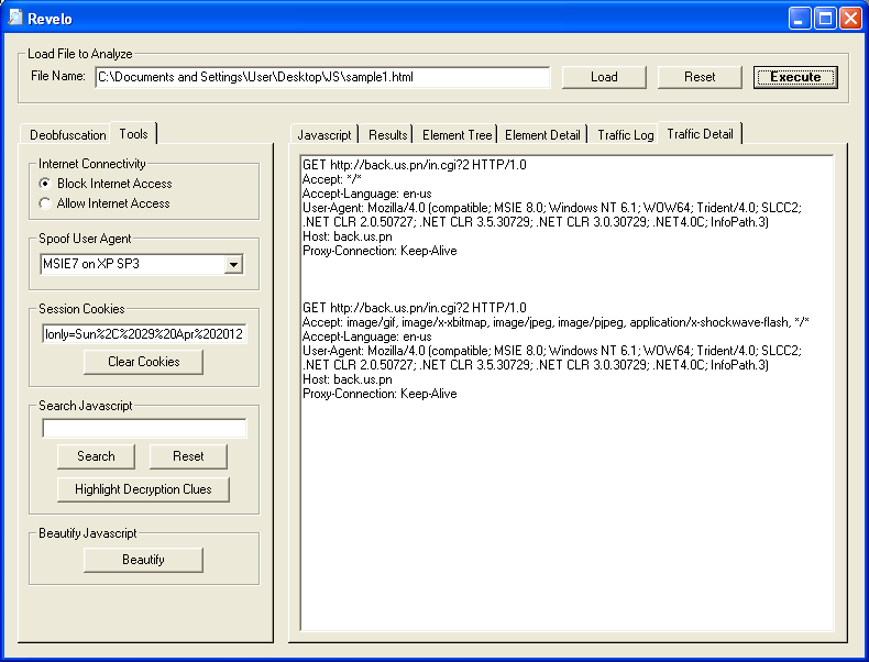 If you go to the “Traffic Detail” tab, you can see the GET requests made by the script. Because the program’s Internet Connectivity option (left panel) is set to “block”, the requests were dropped and never left your PC. Notice also that this script sets a cookie. If you don’t clear the cookie after each execute, the script may not do anything.
