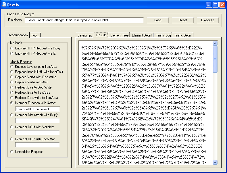 Let’s use the “Intercept Function with Name” method and copy/paste that decodeURIComponent call then go to the “Results” tab. Cool…we just got the hex values of the deobfuscated script!