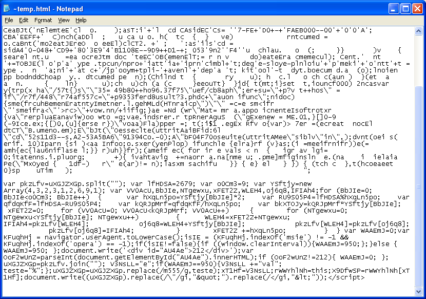 Last thing to mention is that the tool creates a temporary file called “~temp.html” which contains the original script plus its attempt to deobfuscate the code. You can have a look to see what it’s doing by opening this file in Notepad (do not open it with your browser directly since you will render the code without protection!).