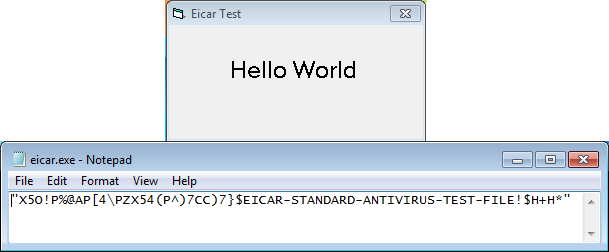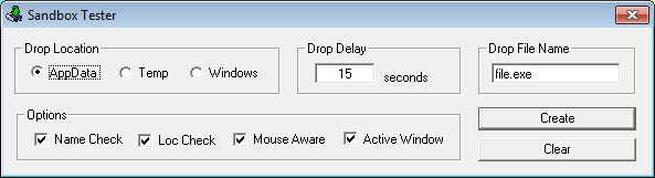 When you make your selections and click on “Create” then this program creates the dropper. This is what you upload to the sandbox. When the sandbox executes the dropper then an executable is dropped into the location you specified, waits a number of seconds (if applicable), then pops up a “Hello World” message and drops an .EXE file to the current path. That file is actually just a text file that contains the Eicar string.