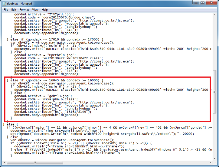 After deobfuscating the script, there’s a new entry for Java 6 Update 0 through 45. Interestingly, the exploit for Java 7 Update 0 through 10 has not been replaced or updated.