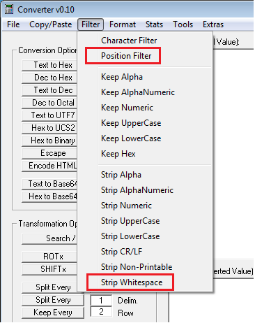 The second is called the “Position Filter”. With it you can extract characters with a fixed position or after a certain character. Here’s a quick example. There’s some base64 characters in between those junk characters. We can extract what we need using this position filter.
