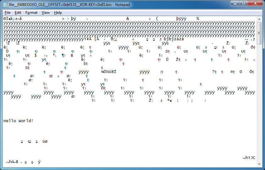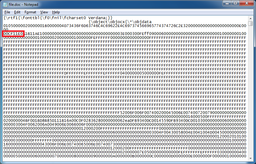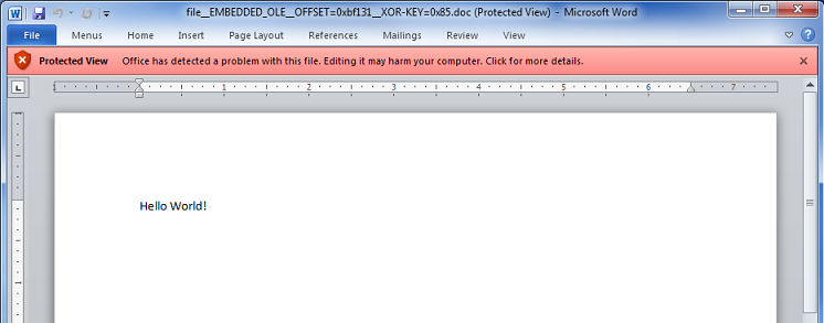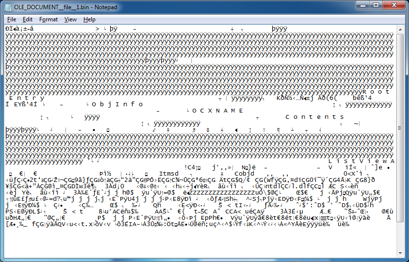 The OLE object is rather small considering the original “file.doc” file is 791KB. Something is wrong. Here’s what the OLE file looks like: