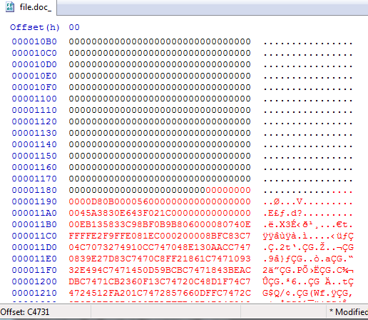We can open this file called “file.doc_” which has the Word magic at the beginning. Now we copy the rest of the binary code from the original “file.doc” file and paste it to the bottom.