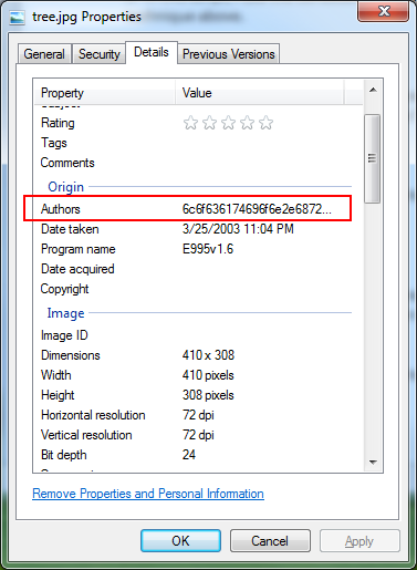 Here’s the shot of the data I added to the graphic file using a hex editor.