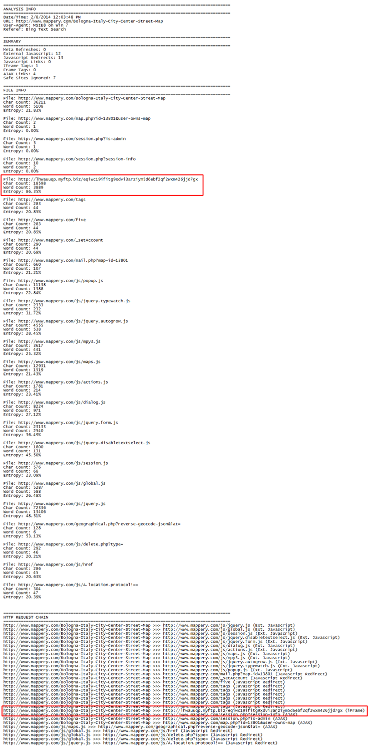 You can see an iframe tag with a strange-looking URL in the above pic. Viewing the log file reveals that this file has a high “entropy” value of 86.35% and is referenced on the main page.