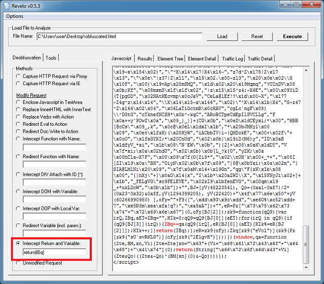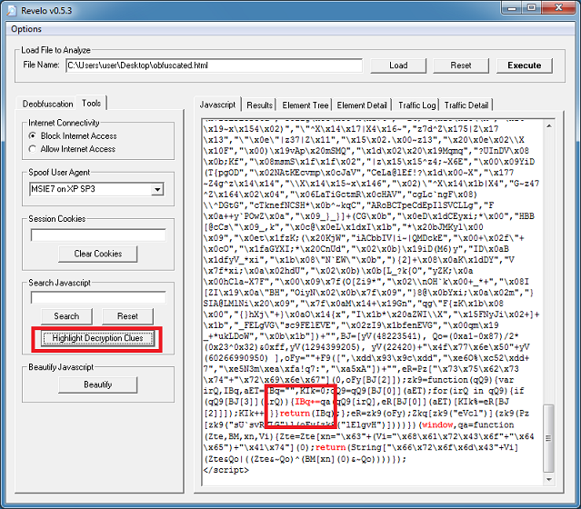 Click on the “Execute” button and go the Results tab to get the deobfuscated text. (Note: the results contain escaped characters but it is essentially deobfuscated.)
