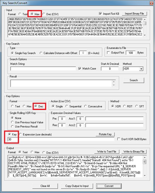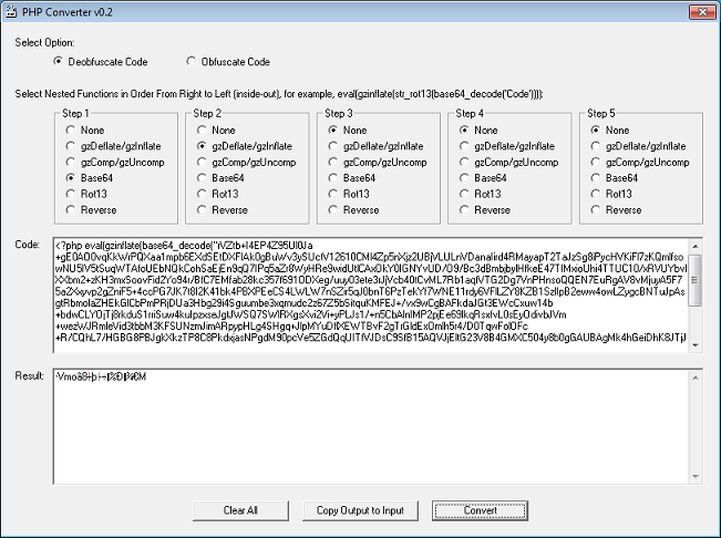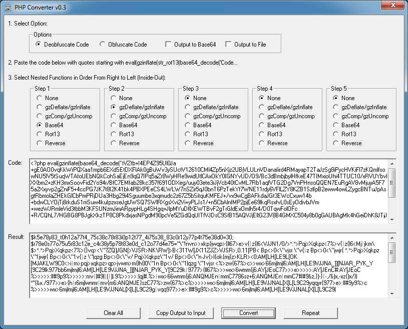 Here’s a new, fixed version of PHP Converter. I added a filter to present the results of the deobfuscation without stopping if it encounters any strange characters. The characters outside the alphanumeric range will be represented by a neutral character.