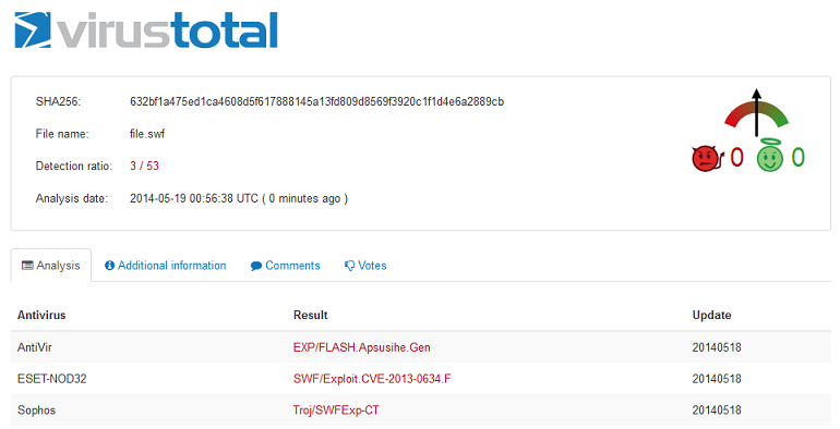 After converting the decimal values to hex and writing it out to a binary file, I get another SWF file (MD5: 04FC52BE437FF46465F42994F0DC5AAE). VirusTotal detects this with 3 out of 53 AV with one saying it’s CVE-2013-0634.