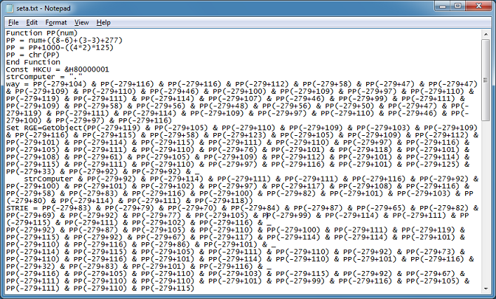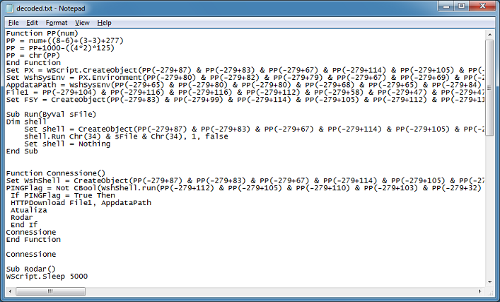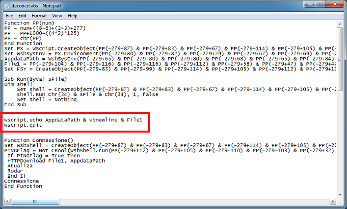 There’s several functions in this script and the one at the top deobfuscates the content by doing some math to convert decimal values to ASCII. The AppdataPath and File1 variables look interesting so I just add this to the script: