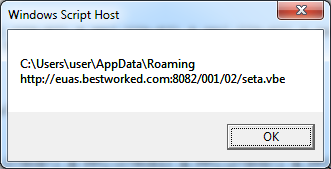 This pops up the deobfuscated values then quits before it executes anything further. Here’s the result which tells us where the file will be written to and where to download the file from.