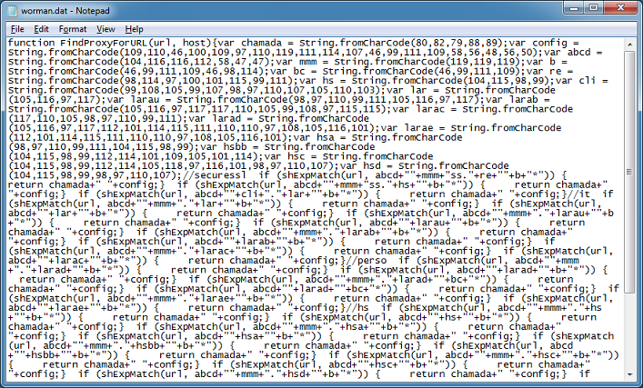 This turns out to be a proxy.pac malicious script! Downloading the third file, I get this obfuscated proxy.pac file.