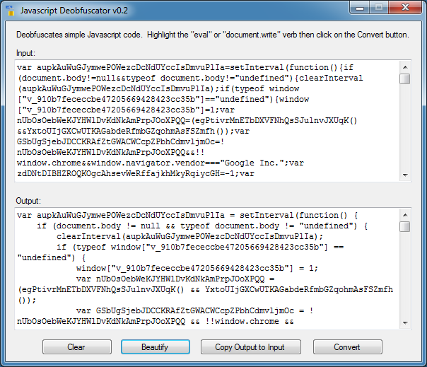 Just a quick update…I added a Javascript beautification feature. Just click on the “Beautify” button and the results will appear at the bottom.