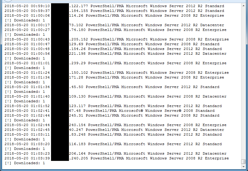 This log file is more interesting as it shows successes and failures from many IPs. “Infected” devices include Windows 7, Server 2008, Server 2012, and Server 2016.