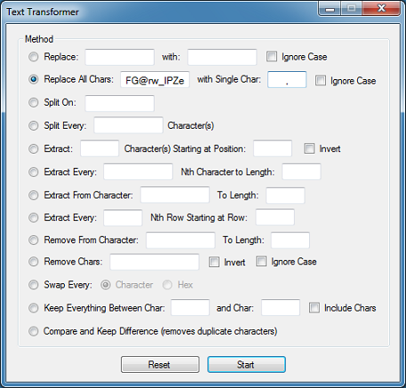 First thing is to copy that string into Reneo then click on Edit > Text Transformer. Since we want to end up with decimal values separated by commas, I enter this into the method called “Replace All Chars…”.