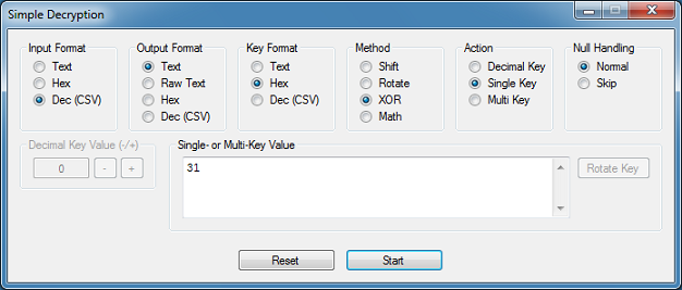 As expected, I get nothing useful because it’s “encrypted”. I then click on Decode/Decrypt > Simple Decrypter and make the following choices — decimal input, hex key, XOR method, single key action, and enter 31.